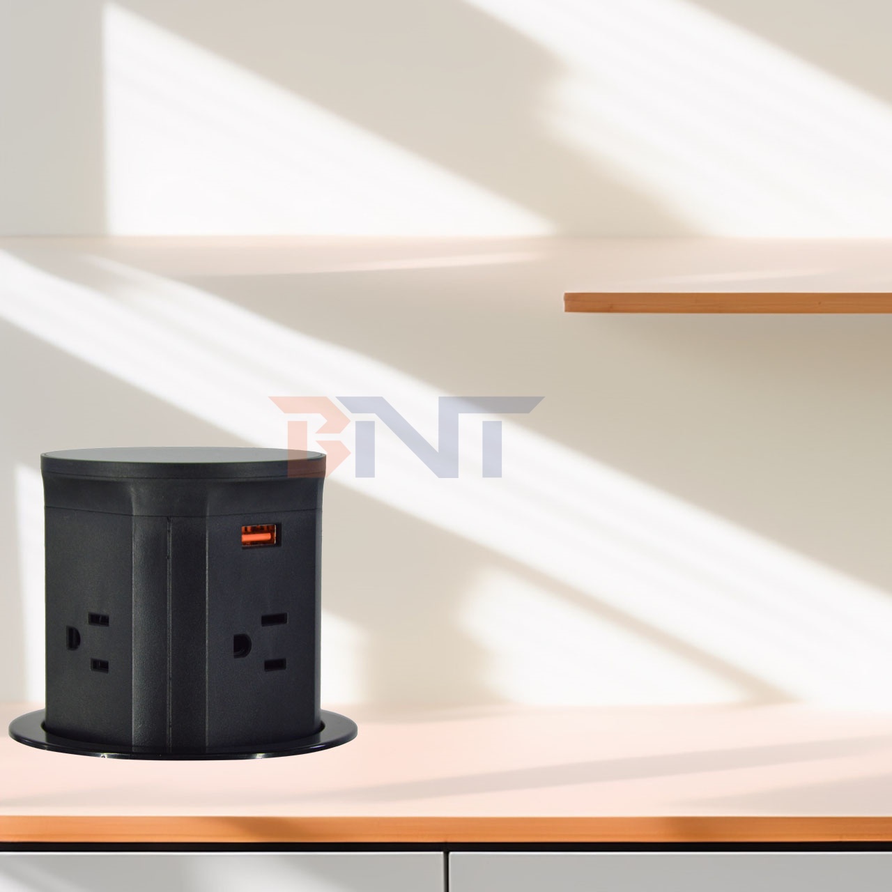 The unique pneumatic lifting mechanism allows the socket to rise smoothly with just a gentle press, and smoothly fall back to hide on the desktop when pressed again.