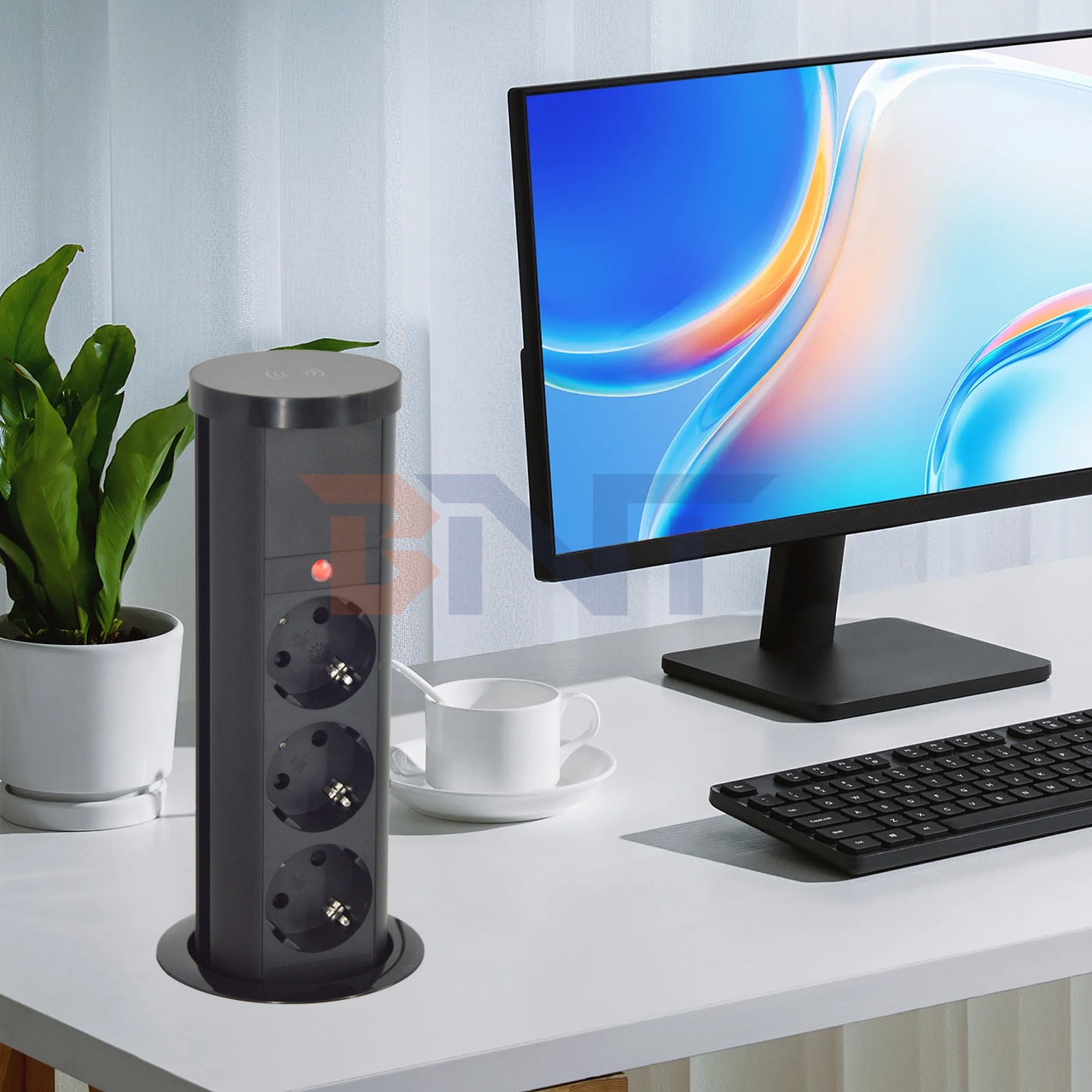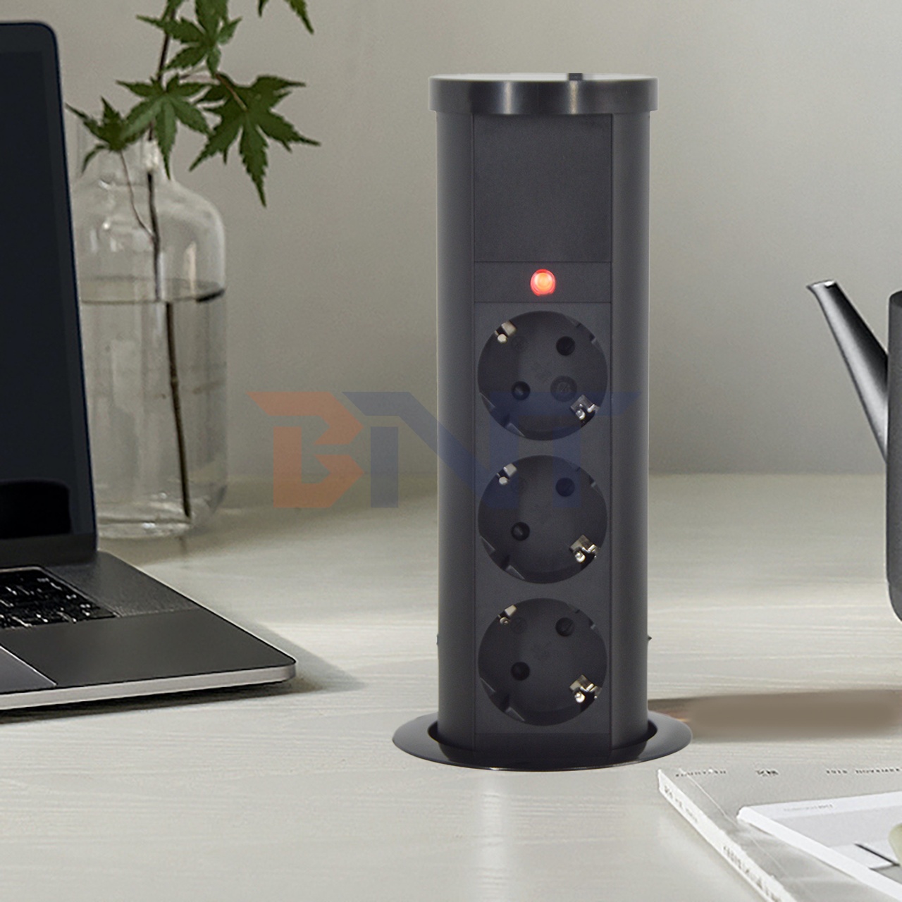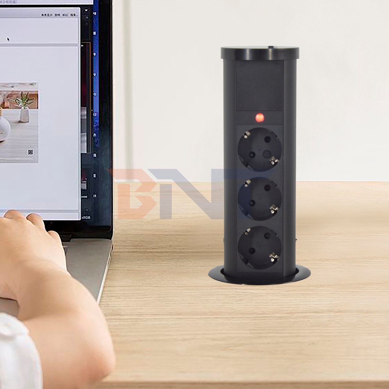 The unique pneumatic lifting mechanism allows the socket to rise smoothly with just a gentle press, and smoothly fall back to hide on the desktop when pressed again.