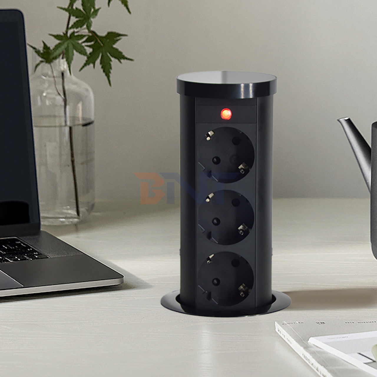 The unique pneumatic lifting mechanism allows the socket to rise smoothly with just a gentle press, and smoothly fall back to hide on the desktop when pressed again.